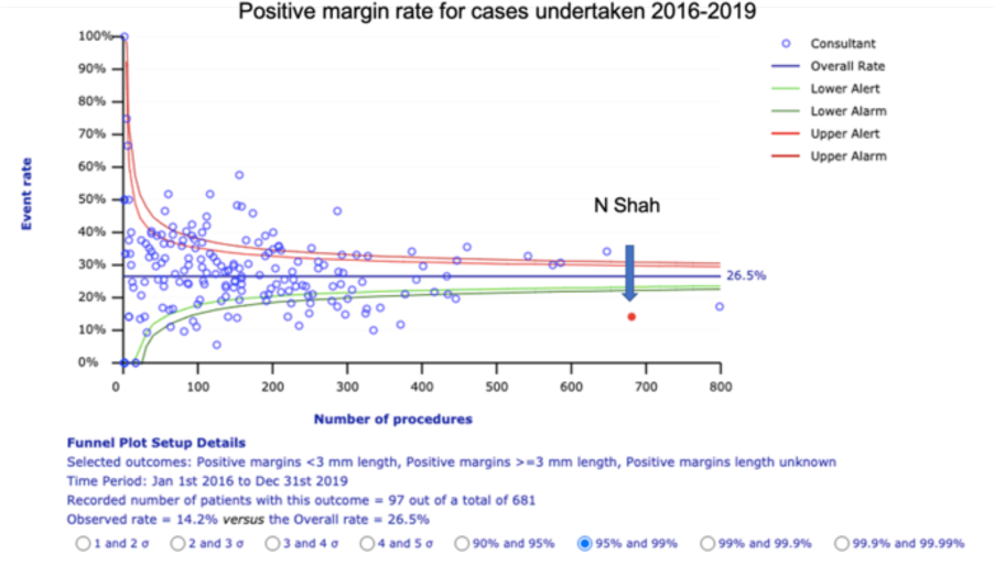 One of the markers of cancer clearance is the positive margin (presence of cancer cells at the limit of prostate gland excision) rate and the funnel plot below demonstrates Nimish Shah’s positive margin rate for all the cases performed in 2016-2019 overall was 14.2% compared to the national average 26.5%.